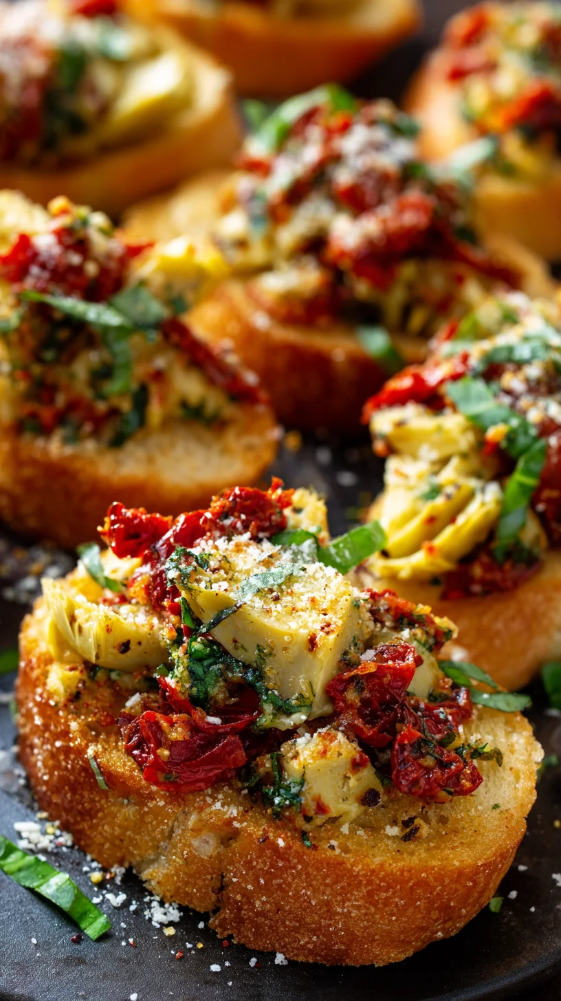 - Assemble the Bruschetta: Spoon the artichoke topping evenly over the toasted baguette slices.