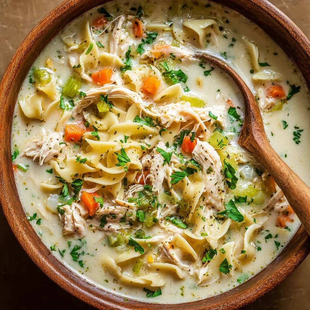 Indulge in a bowl of pure comfort with this rich and velvety Creamy Chicken Noodle Soup, packed with tender chicken, wholesome vegetables, and delicate egg noodles.