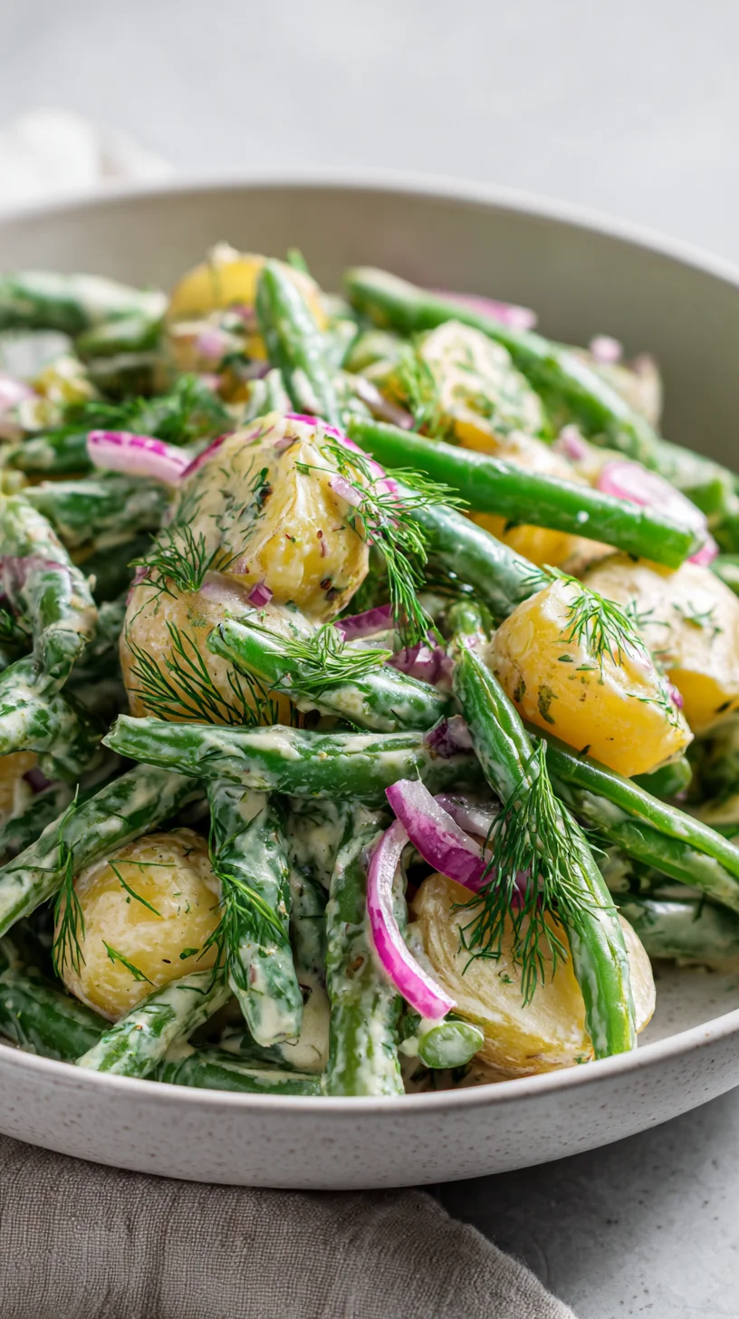 Keywords: potato salad, green bean salad, creamy potato salad, dill potato salad, summer salad, picnic side, potluck recipe, vegetable salad, easy salad